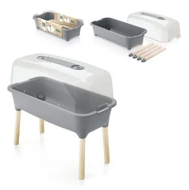 Uprawa nowalijek, ziół czy dorodnych roślin ciepłolubnych, wrażliwych na działanie warunków atmosferycznych - niezależnie od naszych potrzeb i ambicji ogrodniczych - zawsze daje radość z wcześniejszych zbiorów, zwłaszcza w samym środku zimy. Lekkie transparentne wieko z regulowanymi otworami wentylacyjnymi stwarza idealny mikroklimat i zapobiega zaparzeniu roślin, a dodatkowo chroni rozsadę przed dokuczliwymi insektami. Oryginalny charakter skrzynki podkreślają nogi wykonane z jasnego, twardego drewna.