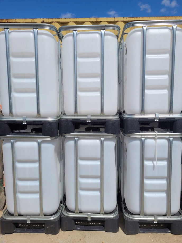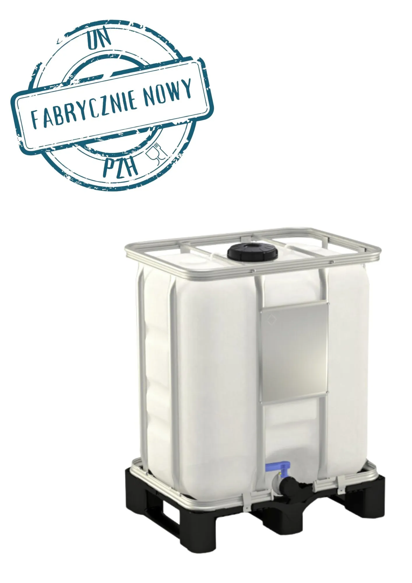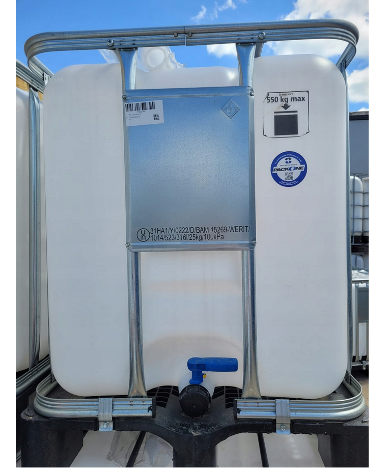 Fabrycznie nowy Zbiornik IBC 300l z Un zostały skontrolowane i są dopuszczone do napełniania niebezpiecznymi płynami według UN 31 HA1/Y/D/BAM. Oznaczenie UN jest umieszczone na pojemniku wewnętrznym i na tabliczce znamionowej. Wykonane z trwałego HDP odpornego na pęknięcia, promienie UV. Stabilna paleta z zamocowaną na stałe stalową ramą zapewnia bezpieczeństwo w trakcie obsługi. Bezpośrednia widoczność zawartości resztek poprzez zastosowanie wysokiej jakości polietylenu o specjalistycznej gęstości, oraz skali poziomu napełnienia umieszczonej na bocznej krawędzi zbiornika kontenera.
