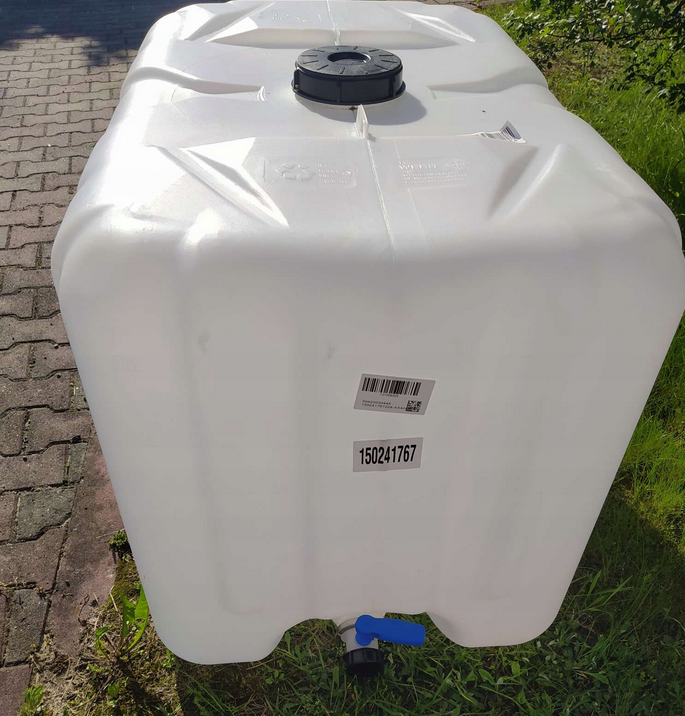 Zbiornik wyposażony w dolny zawór do opróżniania kontenera oraz w górną, odkręcaną pokrywę do podłączenia do rynny. Możliwość wykorzystania pompy do opróżniania pojemnika przez otwór wlewowy.